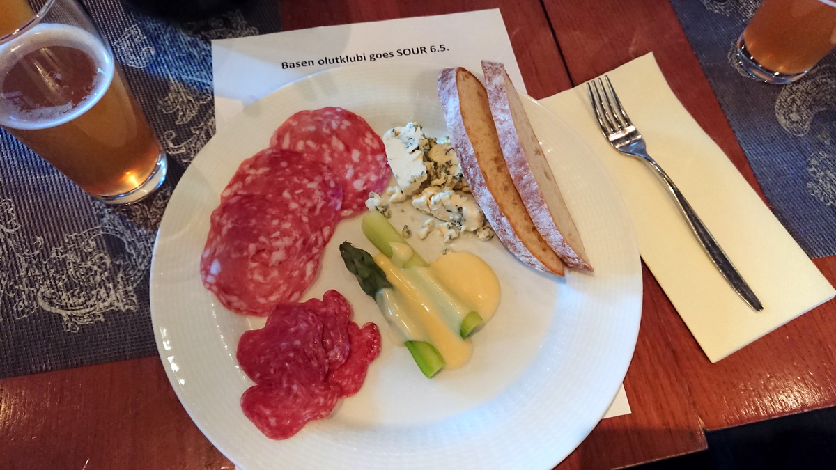 Kävimme molemmat Ravintola Basen olutklubissa maistelemassa hapanoluita (25 €). Alunperin klubi-illassa oli tarkoitus tutustua kotimaisten panimoiden hapanoluisiin, mutta suunnitelma oli näköjään muuttunut hieman matkan varrella. Iltaa isännöi ravintola Basen Aki Tiittanen.