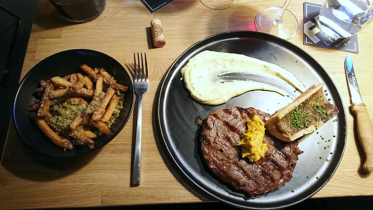 Lautasella oli vielä luuydintä, mutta se jäi hieman paitsioon pihvin ja ranskalaisten rinnalla. Lopuksi Marjutin oli myönnettävä, että kaikkea ei vain jaksa.
