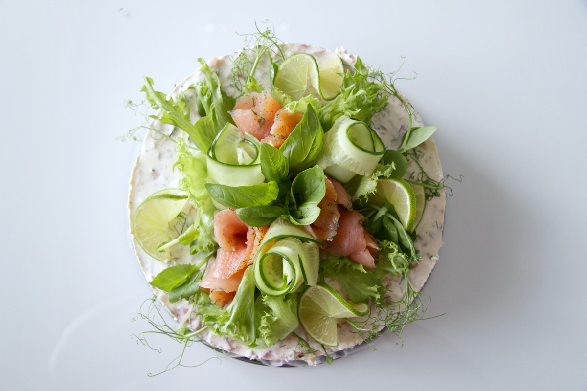 Koristele valmis kakku esim. salaatilla, herneenversoilla, limellä, basilikalla ja kurkku- ja lohiruusukkeilla.
