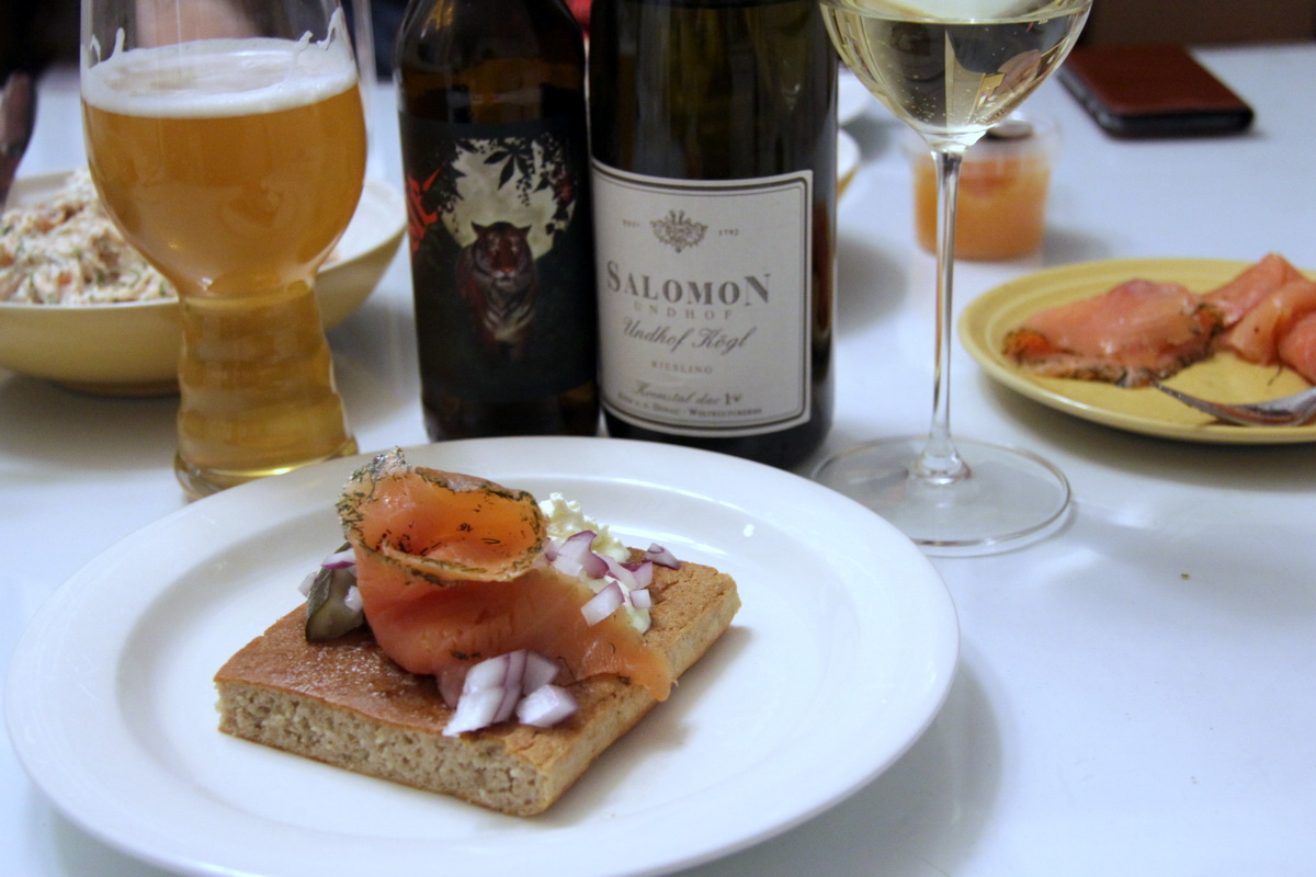 Ruoan kanssa viini toimi hyvin, sen sitruksisuus ja hapokkuus leikkasivat mukavasti blinien ja lohen rasvaisuutta eikä viini riidellyt sillin ja kananmunienkaan kanssa. Kaiken kaikkiaan mainio yhdistelmä, ja rieslingiin voi aina luottaa.