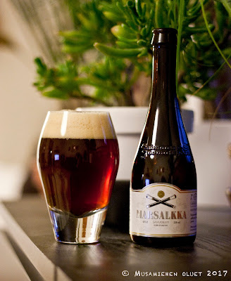 Marsalkka Savuolut on väriltään tumman kuparin punaista. Selkeästi punaisempi kuin Saimaa Vienna. Lähes mahongin ruskeaa. Pinnalle muodostui kaunis vaahtokruunu, joka ikävä kyllä katoa melko nopeasti lähes olemattomiin. Tuoksu on todella mieto. Ei löydy oikeen mitään. Häivähdyksen tervapastillista savua saan haettua, kun kovasti nuuhkin. Toki voihan se voi olla vaan kuvitelmaa, kun tiedää kyseessä olevan savuolut.