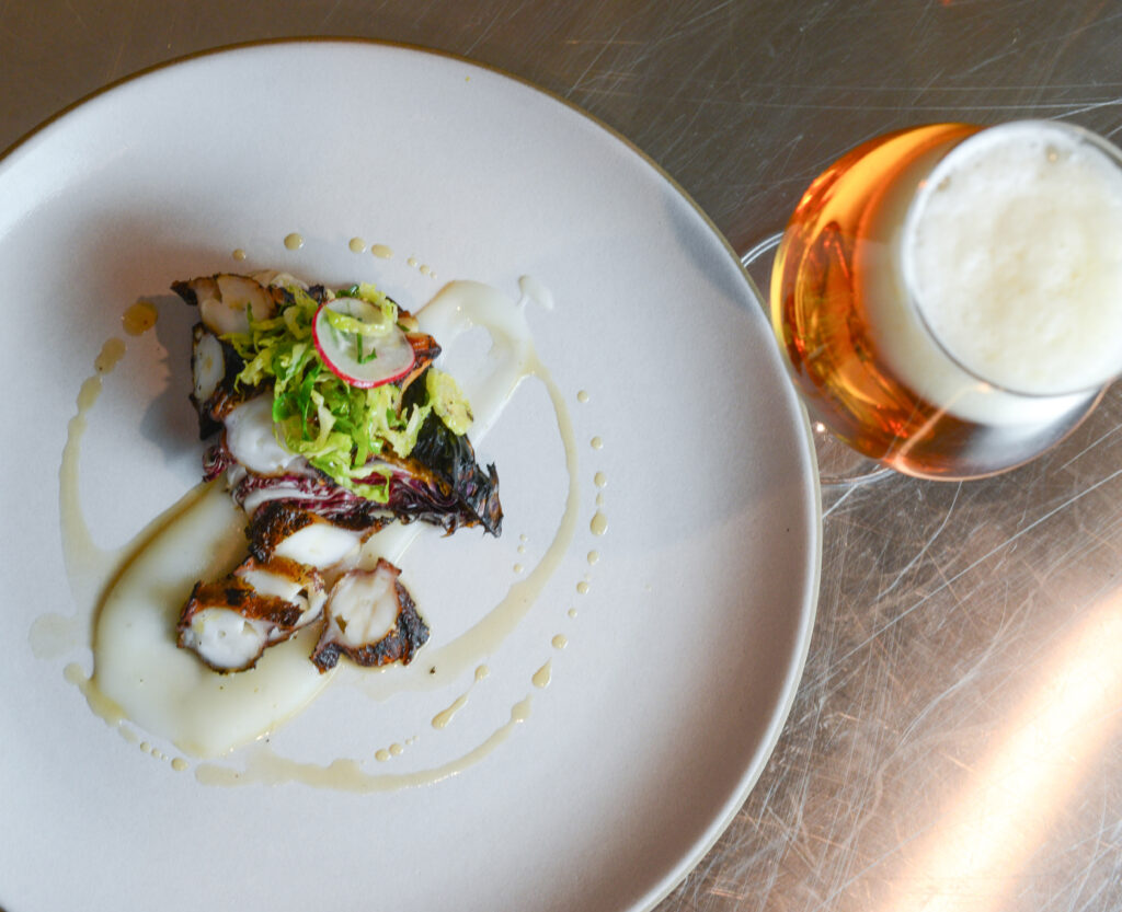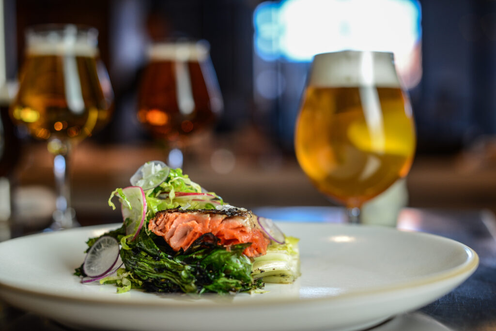 A chilled dish of sea bass crudo paired with an American IPA served a few degrees above the normal serving temperature of 7°C allows the hops full expression and to blend with the delicate flavours of the fish. Ice cold temperatures can mute hop aroma and flavour so IPAs are best served above chilled.