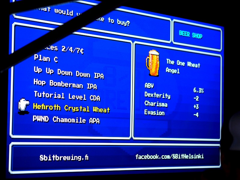 8-Bitin Jasoniakin jututin jäisellä rallienglannilla hetken ja kyselin samalla mitäpä mies itse tiskiltään suosittelisi. English Strong Ale sai kovat suositukset, jota päätin illan jo hämärtyessä lähteä hakemaan. Peliteemainen tiski oli veikeä ilmestys ja näyttävä juomataulu oli kyllä hieno oivallus.