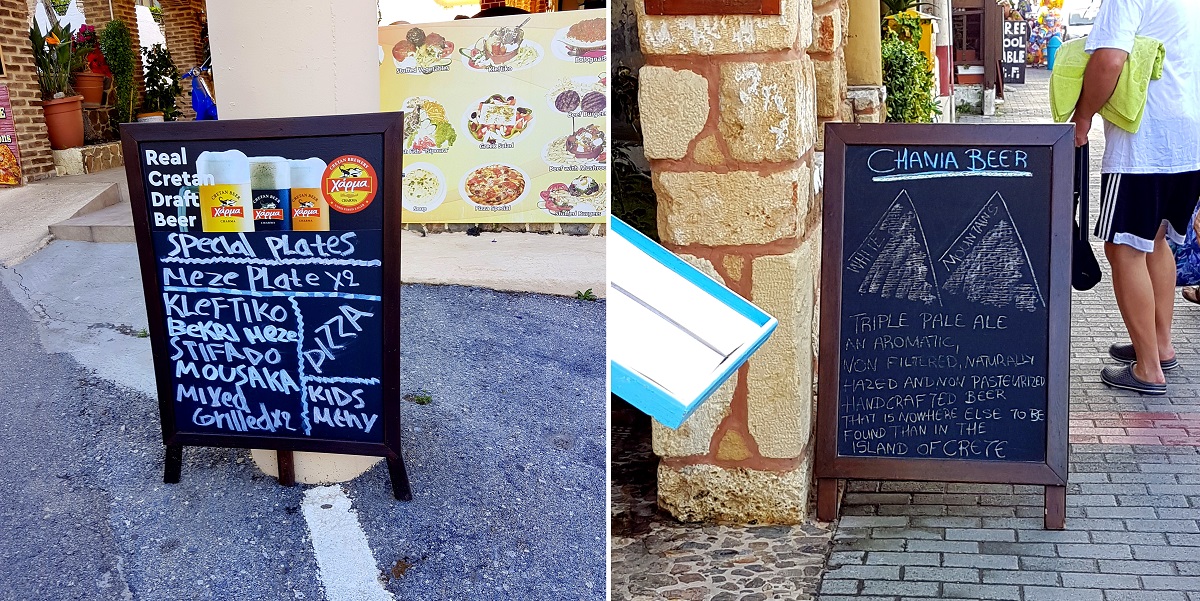 Agia Marinasta ja Plataniaksesta pääsisi ”pääkatua” kulkevalla possujunalinjalla käymään Cretan Brewerylläkin, mutta rantatuolissa harvinaisen pahviseksi todetun Charma Lagerin jälkeen ajatus ei juurikaan houkutellut. Muista saaren panimoista maistoin etukäteen kiinnostavimman eli Σόλοn mainiota Saisonia ja APAa, mutta myös muita alueen toimijoita tuli juomalistoilta ja kylteistä bongattua. Varsin paikkariippuvaista tuo oluttarjonta toki vieläkin on.