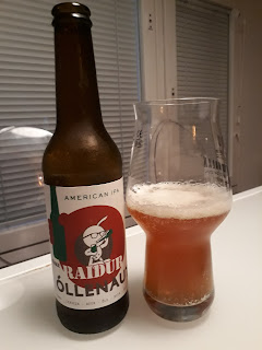 Mutta se siitä, sillä tänään lasiin kaatui virolaisen Õllenautin panema Väike Raidur American IPA. Panimo näyttää sijaitsevan jonkin matkaa Tallinnasta lounaaseen. Ensimmäiset oluet on valmistettu käsittääkseni vuonna 2013. Jonkin verran olen panimon tuotteisiin aiemminkin törmännyt, mutta mitään täysosumaa ei vielä ole muistaakseni vastaan tullut. Katsotaan olisiko Raidur sellainen. Panimo kuvaa olutta näin: ”American IPA brewed with our favourite hops Simcoe, Citra and Columbus.” Alkoholia näyttää löytyvän 7,0%.