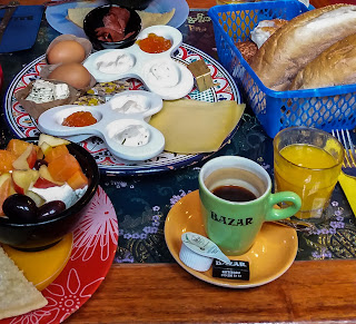 Koska olen kirjoittanut jo iltapäiväoluesta sekä päivällisestä, niin kirjoitetaan lopuksi vielä aamiaisesta. Amsterdamista nimittäin tuntui löytyvän kaikenlaista jännää erityisesti ruokapuolen suhteen. Aamiasta söimme entisessä kirkossa toimivassa Pohjois-Afrikasta sekä Lähi-Idästä inspiraatiota hakeneessa Bazarissa. Koko päivän saatavilla oleva Extra Bazar-setti tarjosi hyvät eväät päivään vahvan kahvin, tuoreen appelsiinimehun, tuhannen reiän pannukakun, erilaisten hillojen, marinoidun feta-juuston, hedelmien, leivän, kananmunien, juuston, makkaran ja jonkinlaisen hapankermalevittiin muodossa.