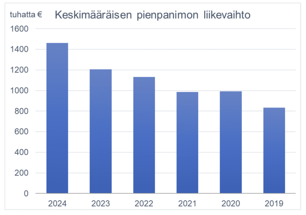 Aloitetaan siis yleiskuvasta. Vuonna 2024 keskimääräinen pienpanimo teki vajaat 1,5 miljoonaa euroa liikevaihtoa, missä on reilut 20 prosenttia kasvua. Nousu oli hieman edellisvuotta ripeämpää ja samaa tasoa kuin vuonna 2022. Takana on siis jo kolme kasvun vuotta vuoden 2021 notkahduksen jälkeen. Silti liikevaihtoaan onnistui kasvattamaan vain noin puolet panimoista, kun vielä vuonna 2023 kasvu-uralla oli 70 % yhtiöistä.