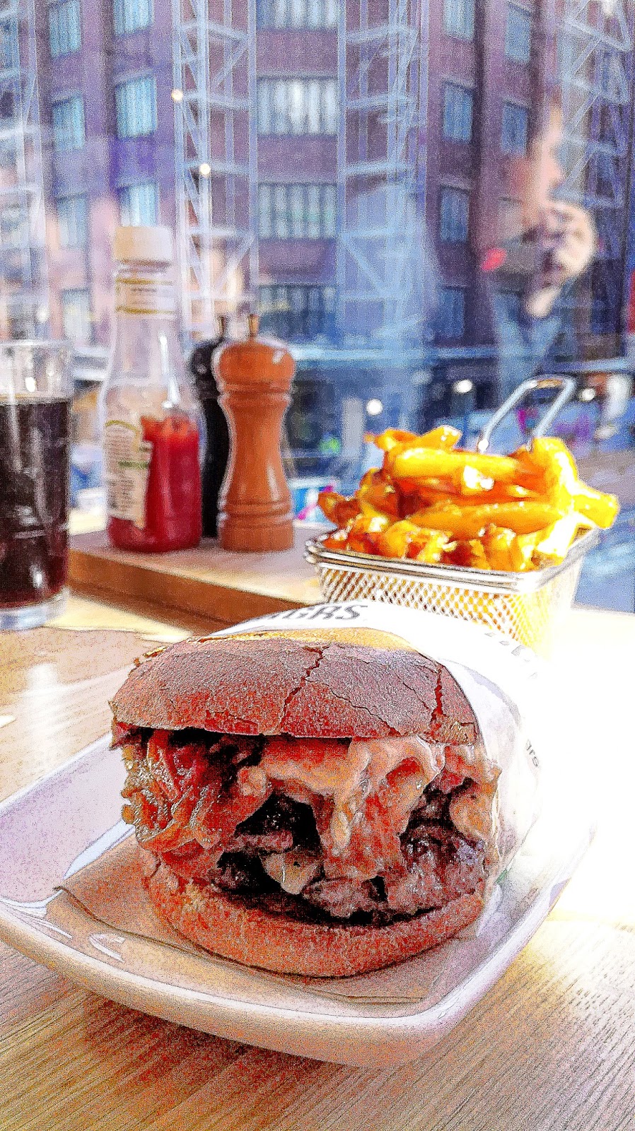 Miltä se nyt maistui? Aika mitäänsanomattomalta, söin mekaanisesti, kuin jotain maksalaatikkoa tai laitosruokaa. Haukkukaa hifistiksi, mutta kyllä ravintolaruoan pitäisi aiheuttaa jotain iloa ja useammalla suupalalla ”ompa hyvää” fiilistä. Se saattoi olla myös hillottu sipuli, tai mitä tuo kuvassakin roikkuva juttu on (se ei ole pekonia siis), joku kastike, sellainen vähän maitomainen ruskeakastike… ei hitto, pieni Googlaus tähän väliin:— Tuore briossisämpylä, 100 % tuore naudanlihapihvi, aitoa cheddarjuustoa, karamellisoitu sipuli, uunipaahdettu tomaatti, umami mayo. Ehkä kokki ei vaan osaa? Mukaan tullut Pete kehui kuitenkin omaa burgeriaan ihan saman makuiseksi kuin ennenkin. Hiton Umami, oliko tästä jotain juttua siinä ”Burgerimies” ohjelmassakin? siis San Fransiscossa söi jonkun tällaisen? Ei ainakaan ensituntumalla ole muuten tuo sarja ihan suurin suosikkini.—