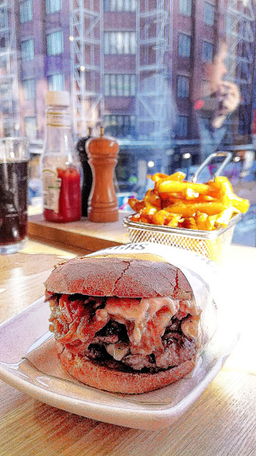 Olen käynyt siellä monta kertaa, pidän paikasta, etsimme jotain uutta mestaa täksi kerraksi, mutta ainoa, minkä nyt keskustasta löysin, oli Elmos Sport Bar ja lounaaksi oli kanaburgeri. Pitikin sattua, kanaahan en syö, mitä nyt melkein joka päivä, mutta siis burgerin välissä jos olen kerrankin menossa burgerilla herkuttelemaan. No, Friendsissä otin jotain uutta: Umamiburgerin. Tavoitteena siis uudenlaista makunautintoa, vähän kun kävisi uudessa paikassa, sellainen ”otin taas vakioburgerini ja oli taas hyvä” on vähän hassu linja näin kirjoittelun kannalta tai yleensäkin jos on olevinaan burgereita harrastavinaan. Olenko? Paha kysymys. Tavallaan, tavallaan en. Siis alunperinhän idis olis vaan syödä pelkkää burgeria joka päivä parilla matkalla, vähän ehkä läpälläkin, sitten siitä jäi pikkasen tuollainen harrastuksen maku, kun kerran lähdettiin Lontooseen Shake Shackin takia (toki muutenkin viihdyttiin, mutta tämä oli oikeasti matkan liipaiseva tekijä) ja hotlakin otettiin ihan nurkilta. Sanotaan nyt vaikka, että olen painottanut tiettyjen reissujen ruokapuolta burgeriin, siis sellaisten kohteiden, mistä tiedän löytyvän vähän parempaa. En ota esim. Englannissa pubissa burgeria, koska ne jotka olen syönyt olivat aika huonoja. En yleensä tilaa pizzeriassa tai nakkarilla burgeria, en käy useinkaan Mäccärissä ja vastaavissa. Onhan tuossa jotain snobismia ja harrastuneisuutta? Toisaalta olen laajentanut bloginkin aihetta vähän muuhunkin. Joskus burgerit jopa kyllästyttävät, en niitä ainakaan sen takia ala syömään, että saan jotain kirjoitettavaa.