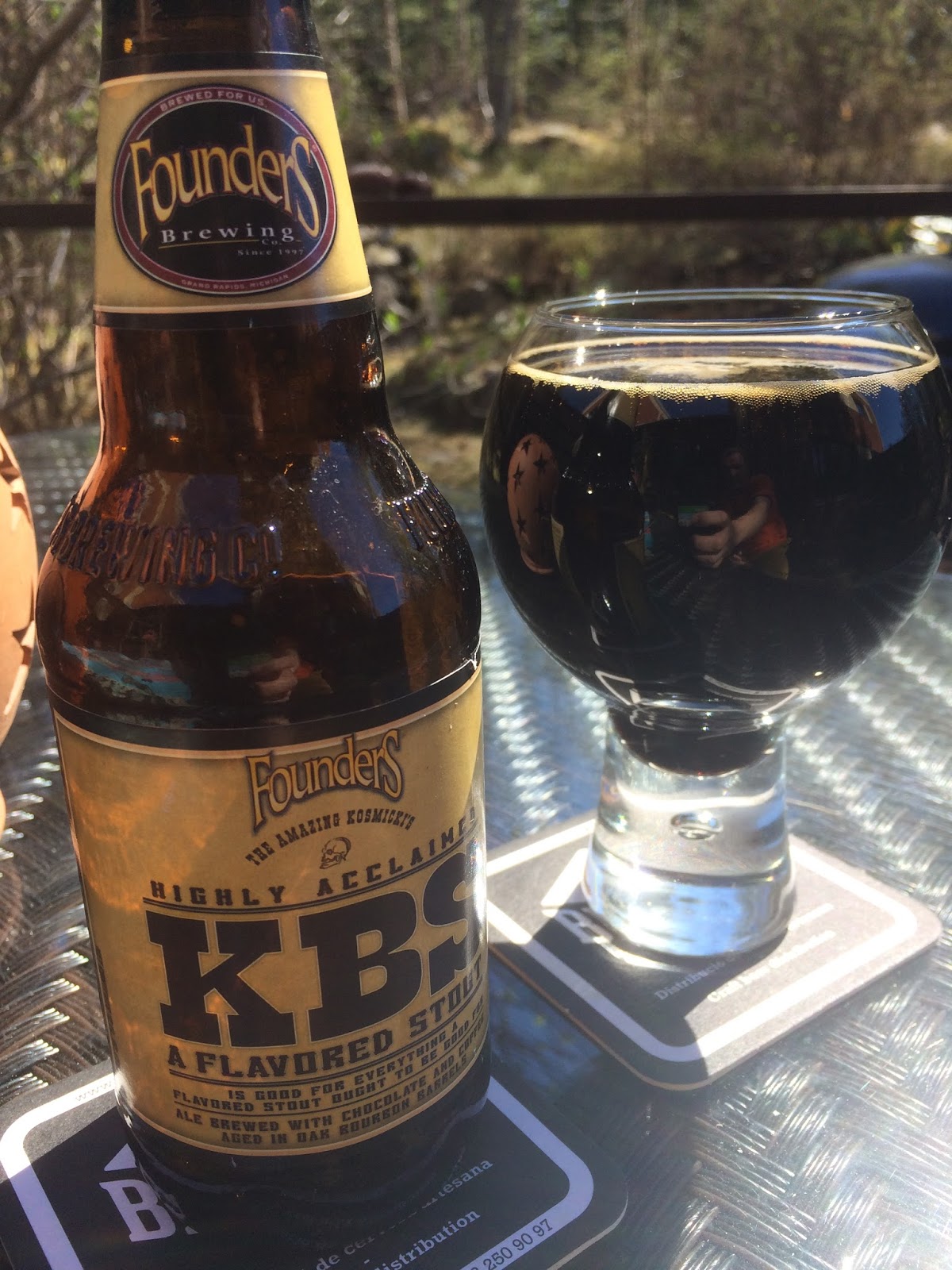 Aurinkoisen päivän terassiolueksi valikoitui musta imperial stout, en sitä ihan siihen tarkoitukseen ole mieltänyt. Avasin sen ihan jääkaappikylmänä, mikä ei sekään ehkä mennyt ihan protokollan mukaan, ehkä se kuitenkin vähän paransi sopivuutta. Kentuckylainen aamiais-stout on mustaa ja pinnalle muodostuu kermaista vaahtoa. Maku on painavaa, muttei raskasta. Paahteisuutta riittää, suklaata ja kylmää vahvaa kahvia. Pullon pinnan tahamaisuus ilmestyy pian lasin pinnalle. Kyllähän tästä tulee likööri mieleen, sen verran täyteläistä tavaraa on. Mainio nautiskeluolut keväisellä ei-helteiselle — terassille, sopii varmasti myös pimeämpiin talvi-iltoihin. — Jälkimaku on todella pitkä ja pehmeä. 355 ml, 11,9 %, 5/5