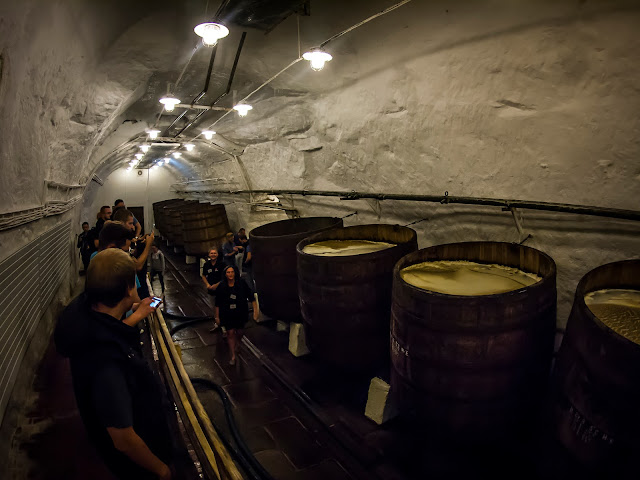 Siirrymme panimotiloista taas turistikierrosta varten rakennettuun tilaan, jossa näytillä on panimon alkuperäinen teräksinen käymisastia. Astia kaivettiin ensimmäisen maailmansodan aikaan maan sisään, ettei terästä olisi otettu sotateollisuuden käyttöön ja samasta syystä se piilotettiin toisen maailmansodan aikana panimon alla oleviin luoliin jään sisään. Mielenkiintoista ja hienoa, mutta silti vain välivaihe matkalla kaikkein pyhimpään. Paikkaan, jota tässä vaiheessa kaikki jo odottavat. Tuo paikka on tietysti panimon alla olevat luolat, jossa tarjolla olisi sitä suodattamatonta ja pastöroimatonta aitoa Urquellia. Samalla reseptillä, näin ainakin väitetään, vuodesta 1842 valmistettua ensimmäistä vaaleaa pils-tyylistä lageria. Oppaamme Eva osaa hommansa. Porukka on janoista ja hän tietää sen. Tunnelma nousee oppaan johdatuksella, hetki lähenee. Kävelemme pari sataa metriä viileissä luolastoissa. Hotellihuoneessa ollut kevyttoppaliivi oli tarkoitettu tänne otettavaksi, oppaallakin sellainen on, mutta ei meille siitä kukaan kertonut. Ei ole niin väliksikään, koska suomipojat ovat viileydestä lähinnä mielissään. Siirrymme muutaman mutkan jälkeen viimein tilaan, jossa on isoja neljätuhatlitraisia tammitynnyreitä. Kolmessa esillä olevassa tynnyrissä on avokäyminen meneillään. Nousen parvelle ja katselen, että tuossa sitä nyt on. Aiemmin kuulimme termin ”parallel brewing”. Se tarkoittaa sitä, että Urquell ottaa jokaisesta oluterästä osan kellareihin käymään perinteisellä tavalla ja sitten lopputulosta verrataan nykyaikaisella tavalla tehtyyn. Kuulostaa hienolta markkinoinnilta, mitä se varmaan onkin, mutta kaikki tuntuu tässä vaiheessa hienolta. Elämys on vain metrien päässä.