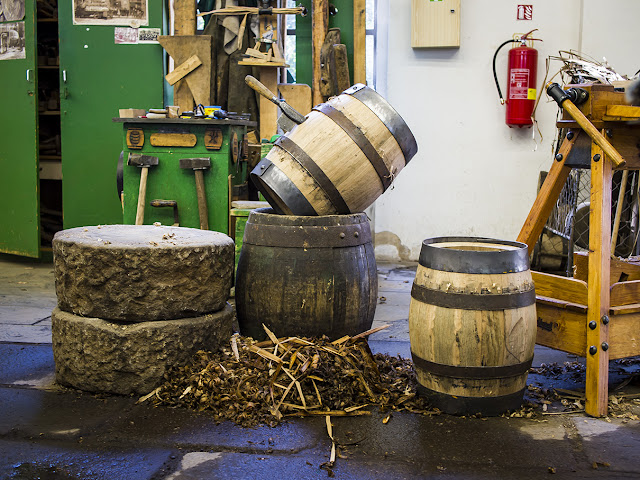 Virallinen kuvaaja, joka seuraa mukanamme melkein joka paikkaan, ottaa koko joukosta kuvan panimon kuuluisalla portilla. Jatkamme vihreän ryhmämme kanssa ensin panimon perällä olevalle verstaalle, jossa panimon ”cooperit”, eli tynnyrintekijät ovat juuri lopettaneet päivän työnsä. Siirtyminen tapahtuu bussilla – tehdasalueella on sen verran mittaa, ettei blogisteja sun muita haluta kävelyttää sen läpi. Hersyvästi naurava ja vauhdikas oppaamme Eva kertoo, että panimolla oli aikoinaan seitsemänsataa tynnyrintekijää, mutta nyt heitä on enää kahdeksan. Aiemmin kaikki olut tarjoiltiin tynnyreistä, nyt valtaosa pullotetaan tai tölkitetään. Useaan otteseen painotetaan, että on pysyttävä ryhmän mukana.