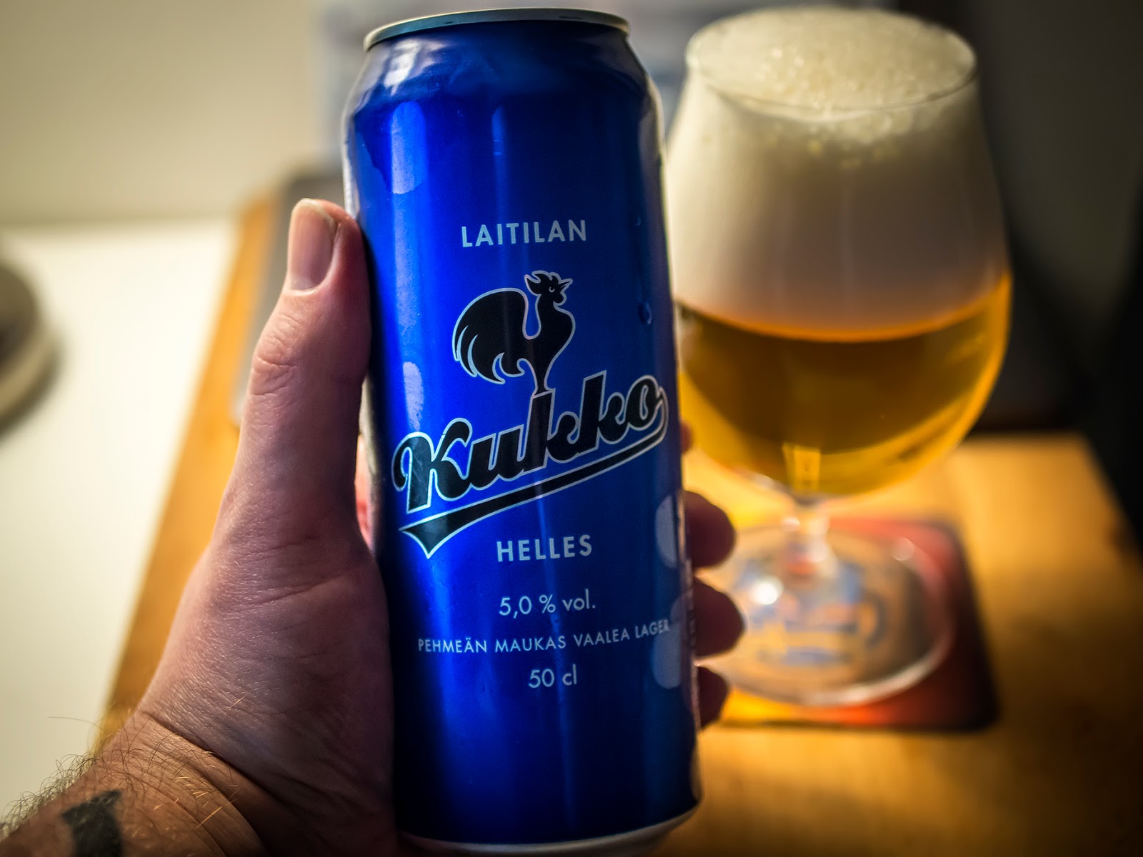 Hioimme timanttia, julisti Laitilan markkinointiosasto, kun Kukko Hellesin 4,7% versio päivitettiin 5,0% vahvuuteen. Tämä sininen Kukko on se, josta olen ehkä saanut eniten negaa palautteiden muodossa. Innostuin nimittäin aikanaan kehumaan 4,7% versiota ja se nyt ei ilmeisesti tällaiselle ihan vaan saksalaistyyliselle peruslagerille oikein käy, varsinkaan jos pidät itseäsi jonkin sortin olutharrastajana. Joka tapauksessa tämä erittäin juotava helles on nyt päivittynyt hieman vahvemmaksi ja bongasin purkin ihan tuoreeltaan Rauman Citymarketin hyllystä. 4,7% versio on siellä maksanut 1,99€ ja tälle oli lätkäisy 2,49€ lappu. Ei paha sekään, mutta korotuksena tietty ”vain” 0,3% tähden jonkinmoinen.