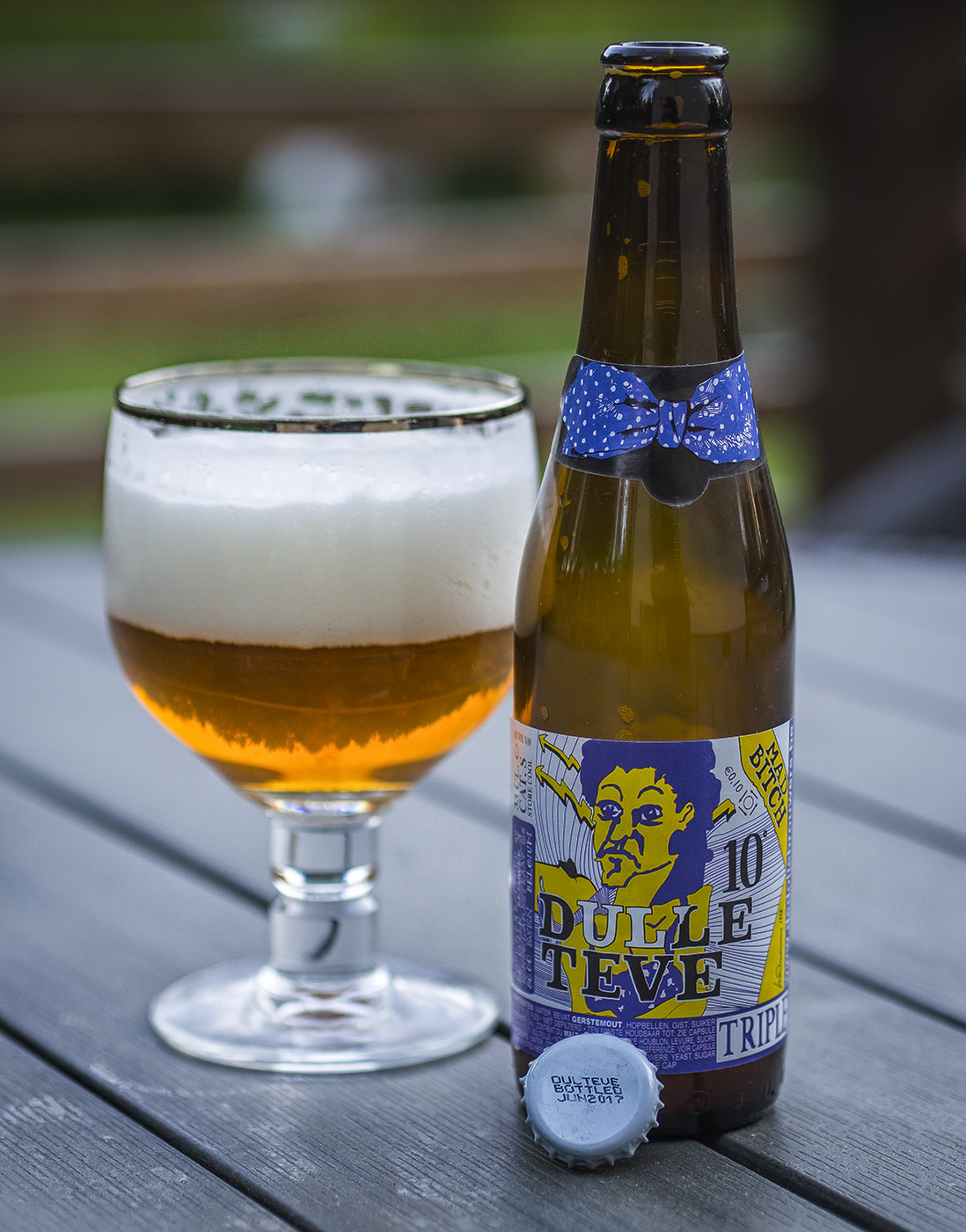 Kirkkaanlainen kultainen olut vaahtoaa villisti – tämäkin on tietysti pullokäytetty. Tuoksu on raikas ja tyylinmukainen – mallasta kevyen viljaisesti, hedelmäisyyttä kuivattuun ja hieman sokeroituun tapaan ja sitten mausteita. Tässä tapauksessa aika runsaastikin mausteisuutta, yrttimäistä ja pippurimaista, ehkä korianteristakin. Hyvä tuoksu, mutta ehkä fruitit jäävät hieman mausteiden alle. Ei tripelin tosin mikään hedelmäpommi pitäisi ollakaan. Maku on myös raikas ja hyvä sekä petollisen juotava. Hieman makeutta ja runkoa alkuun, sitten aprikoosimaisen hunajaiset kuivahedelmät ja loppuun tiukemman mausteinen sinfonia, mutta miltei olemattoman katkerasti humalaa. Tavallaan siis pureva, mutta kuitenkin lopussa todella pehmeä ja alkoholinsa hyvin kätkevä. Katkero joissakin tripeleissä meinaa vetää lopun turhan kuivaksi ja lämpimäksi, omassanikin on ehkä hieman sitä ongelmaa, mutta tässä siis ei. Tripeliin ei ehkä kannata kovin paljoa katkeroa laittaakaan. Tässä luultavasti kaurakin pehmentää tuntumaa. Liian kesyksi homma ei kuitenkaan mene, siitä pitää mausteisuus huolen. Tämähän osuu sysirumasta etiketistä huolimatta setin parempaan puoliskoon, lähelle kärkeä. Ei perinteisin, mutta maukas on.