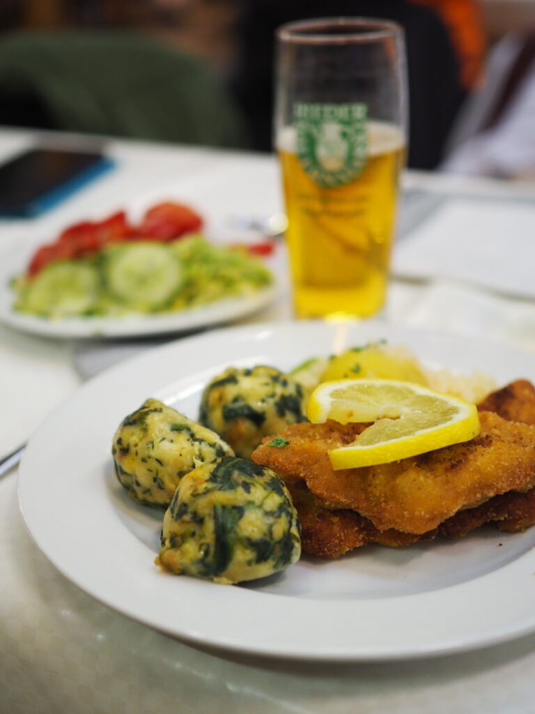 Paikallista olutta itävaltalaisen klassikkoannoksen – wienersnitzelin – kera.