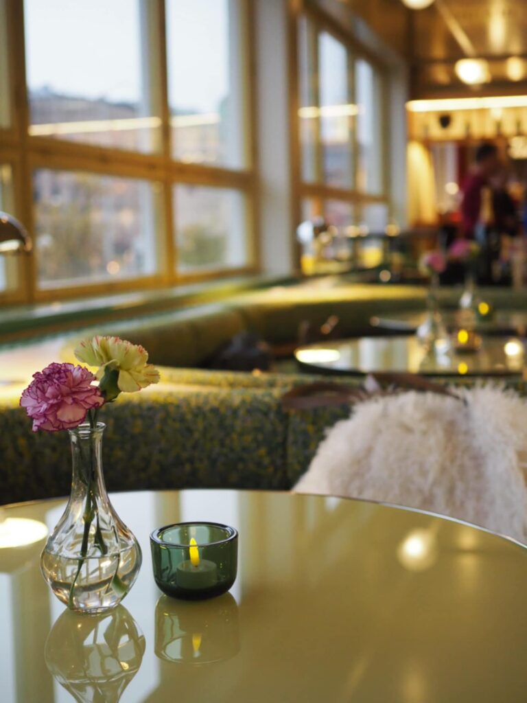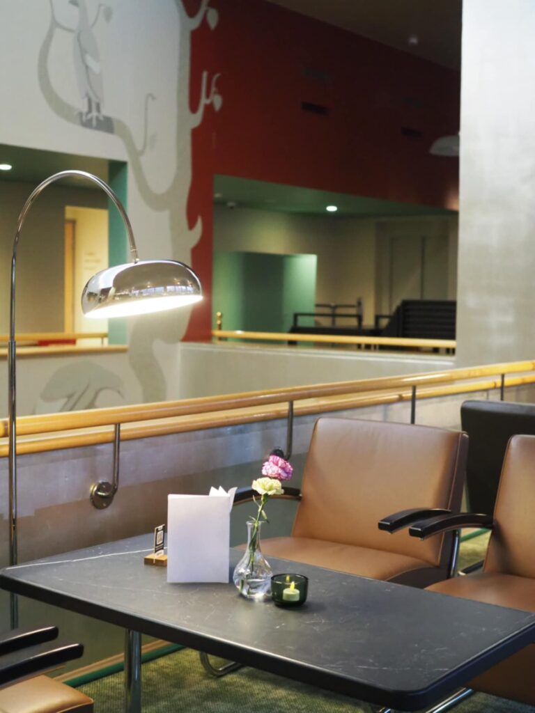 Lasipalatsi onkin klassikko ja kaupungin huomattavimpia funktionalismityylisiä eli tuttavallisemmin funkkistyylisiä rakennuksia, ja ravintola siellä on ollut alusta lähtien samassa paikassa kuin nyt. Funkkistyylinen selkeä ja pelkistetty suuntaus näkyy myös ravintolassa ja nyt uusitussa baarissa, missä värien pohjaksi on otettu viehättävän vihertävä ikkunalauta. Baarin linjat ovat yksinkertaisen kauniita ja sohvat kauniin käytännöllisiä.