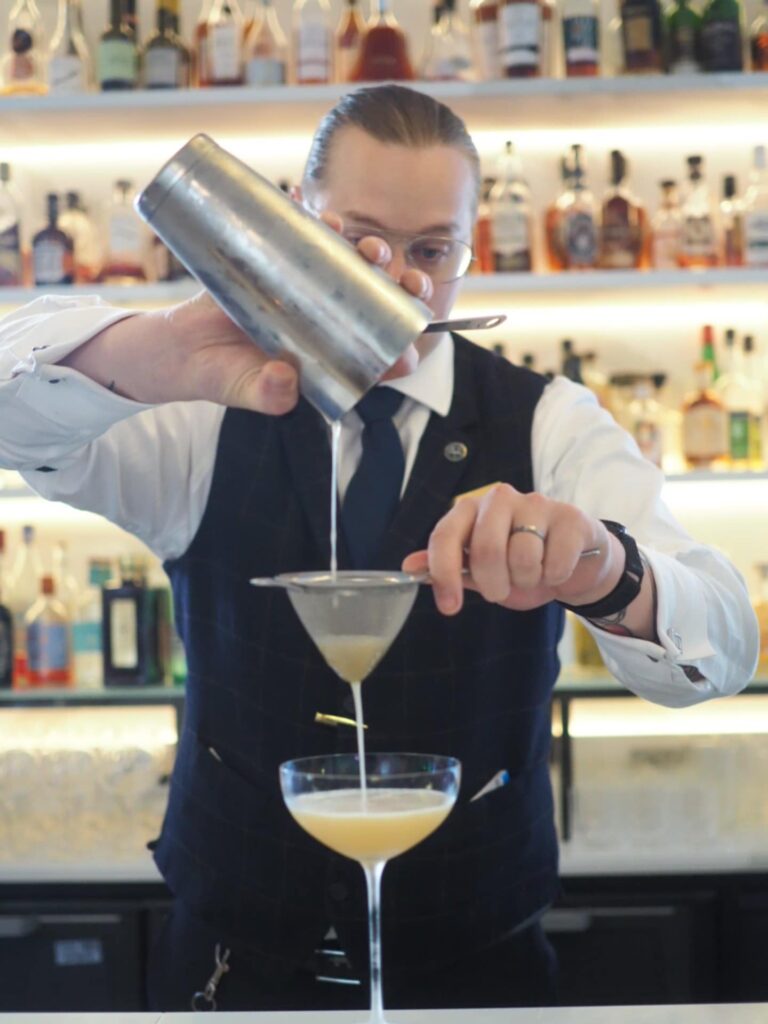 Juomapostille Pietarinen valmisti klassisen hunajaisen Bee’s Knees -ginicocktailin, jonka kylkeen tuotiin baarissa pientä naposteltavaa kansainväliseen tyyliin.