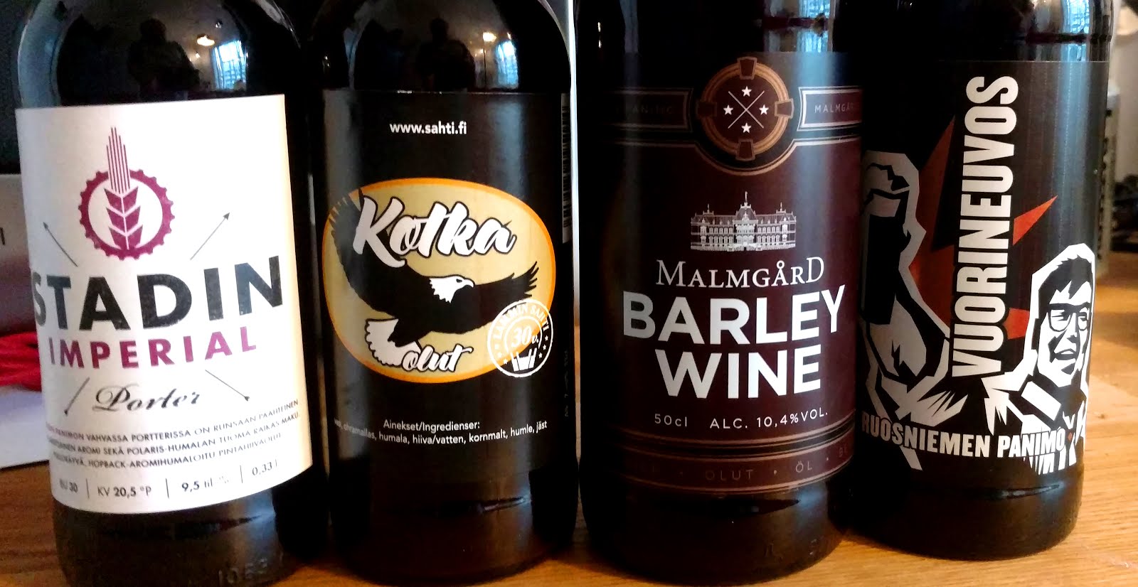 Kaapin kätköistä löytyi Lammin Sahdin Kotka, Stadin Panimon Imperial Porter, Ruosniemen Vuorineuvos ja se helmi eli Malmgårdin Barley Wine. Maistelu oli rento ja melko ex-tempore, joten kuvat ovat myös sitä laatua. Pahoittelut
