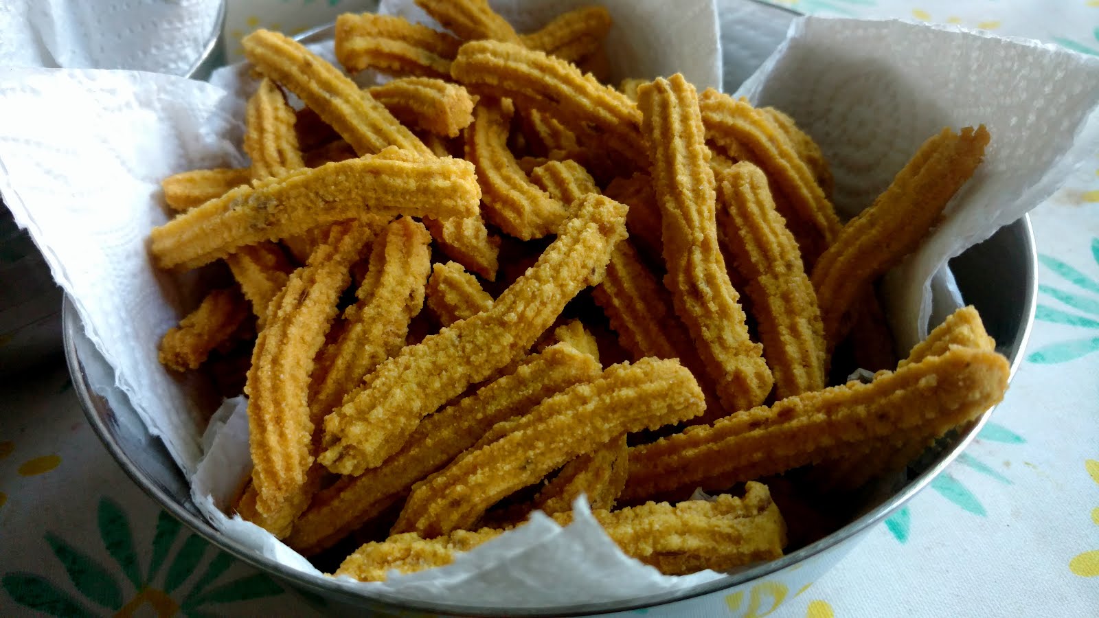 Murukku – Hauskan kuuloinen nimi, hauskan näköinen mato. Ei siis oikea mato vaan riisi- ja kikherne-jauho-seoksesta ja mausteista tehty pötkö. Usein näytään tarjoilevan pyöreäksi spiraaliksi kieriteltynä, mutta snäksi-tarkoituksiin pätkiksi katkottu muoto on näppärämpi. Rashmi oli tehnyt kahta versiota, hieman erilaisilla jauhosuhteilla, vaaleita ja tummia. Vaaleissa aivan aavistus enemmän riisiä. Hyvin pieni riisin määrän lisäys vaikutti suutuntumaan ja ”napsahtavuuteen” aika paljon. Taikina uppopaistetaan öljyssä.