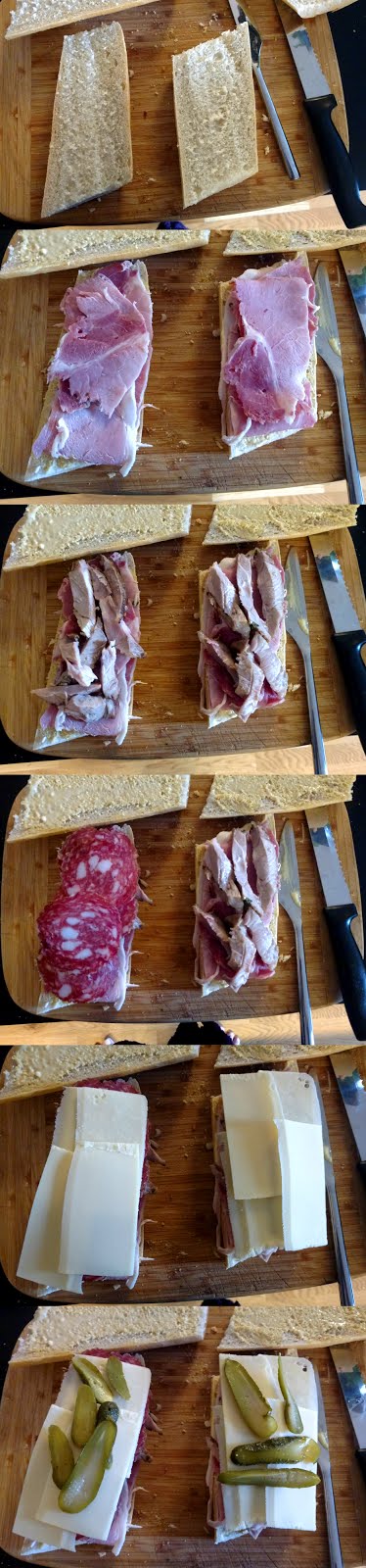 Kuubalaista leipää ei ollut hollilla, joten päädyin ihan peruspatonkiin. Juusto ja maustekurkut myös helppoja hankintoja. Kinkuksi Hakaniemen hallista Kestoleikkeen hyväksi havaittua leppäsavua. Salamiksi mietoa, mutta hyvää salamia Roinisilta edellisen naapurista. Sinapiksi pitäisi olla oikeastaan keltaista jenkkisinappia, mutta kaapissa ollut dijon ajaa saman asian. Päätin ottaa mukaan myös majoneesia. Salamiskismaa kunnioitin sillä, että tein toisen ilman.