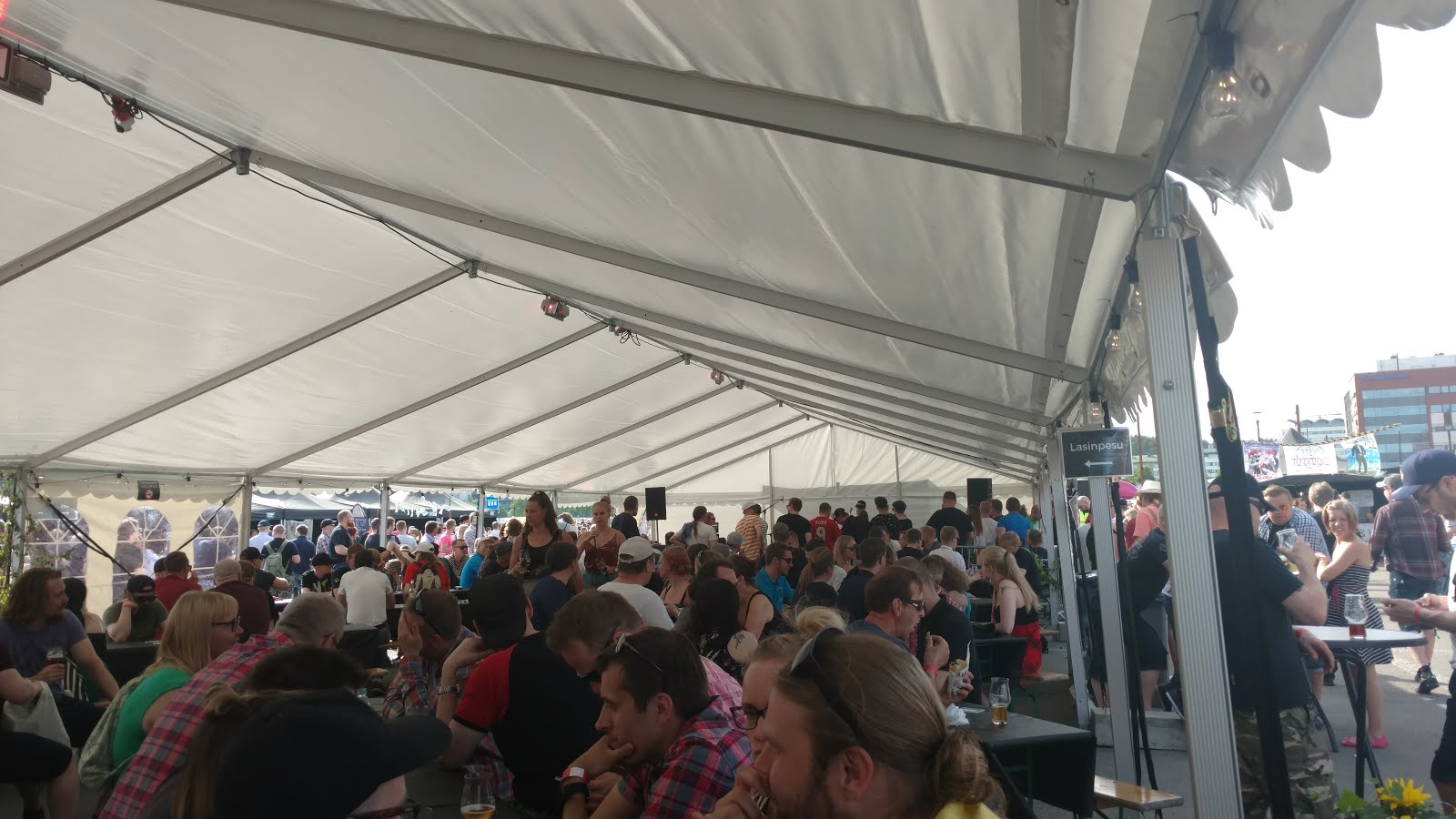 Ja sitten tietysti se ohjelmisto. Musiikkiohjelmasta ollaan tietty montaa mieltä, itse pärjäisin mielellään ilmankin, mutta tuohan se tunnelmaakin. Sen sijaan lavan periaatteessa hyvinkin mielenkiintoinen puheohjelmisto jäi teltta-alueen perällä olevissa pöydissä vähän heikosti avautuvaksi, koska ympärillä on sellainen puheensorina, ettei esityksestä oikein meinaa saada selvää vaikka kuulisikin sen. Naapuripöydistä lähinnä kuuluikin valittelua, että olisivat nyt hiljaa. En tiedä, ehkä ne puheohjelmat pitäisi pitää jossain hillitymmässä tilassa?