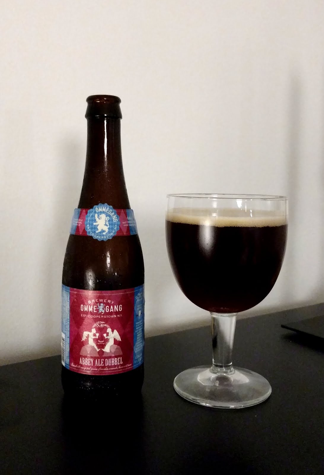 Tilasin kesän alulla netistä olutta. Tilauksessa oli mukana mm. Ommegang-panimolta liuta olusia. Amerikkalaisen belgeihin erikoistuneen panimon lippulaiva Three Philosophers tuli testattua kesällä laiturilla. Hennepin meni intialaisen ruuan parina ja muut jossain välissä, mutta jääkaapissa on hengaillut tämä Abbey Ale Dubbel odottamassa vuoroaan jo kovin kauan.