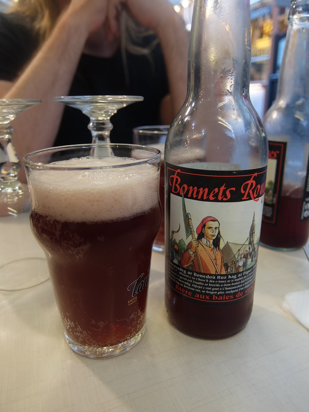 Sitten nousimme mekin ja yritimme etsiä ravintolaa, joka ei olisi creperié. Mahdoton tehtävä, sillä alue on niin tunnettu crepes— ja galette –letuistaan, että vanhan kaupungin joka ainoa ravintola oli myös— creperié eli lettukahvila, ihan sama mitä se varsinaisesti tarjoili. Yksi aiemmin nautittu galette oli vienyt nälkää hetkeksi, isomman ruuan perässä saikin vaeltaa pidempään. Lopulta runsaundenpulaan tukahtuen menimme johonkin oudosti merirosvoteemaiseen turistirysään pihville. Sieltä sai myös paikallista olutta, Lancelotin Les Bonnets Rouges, joka oli melko mitätön kokemus. Maustettu marjainen ja vetinen mehuolut. Lancelotin oluita tuli maistettua muutama muukin jossain välissä. Perustason kamaa pääosin.