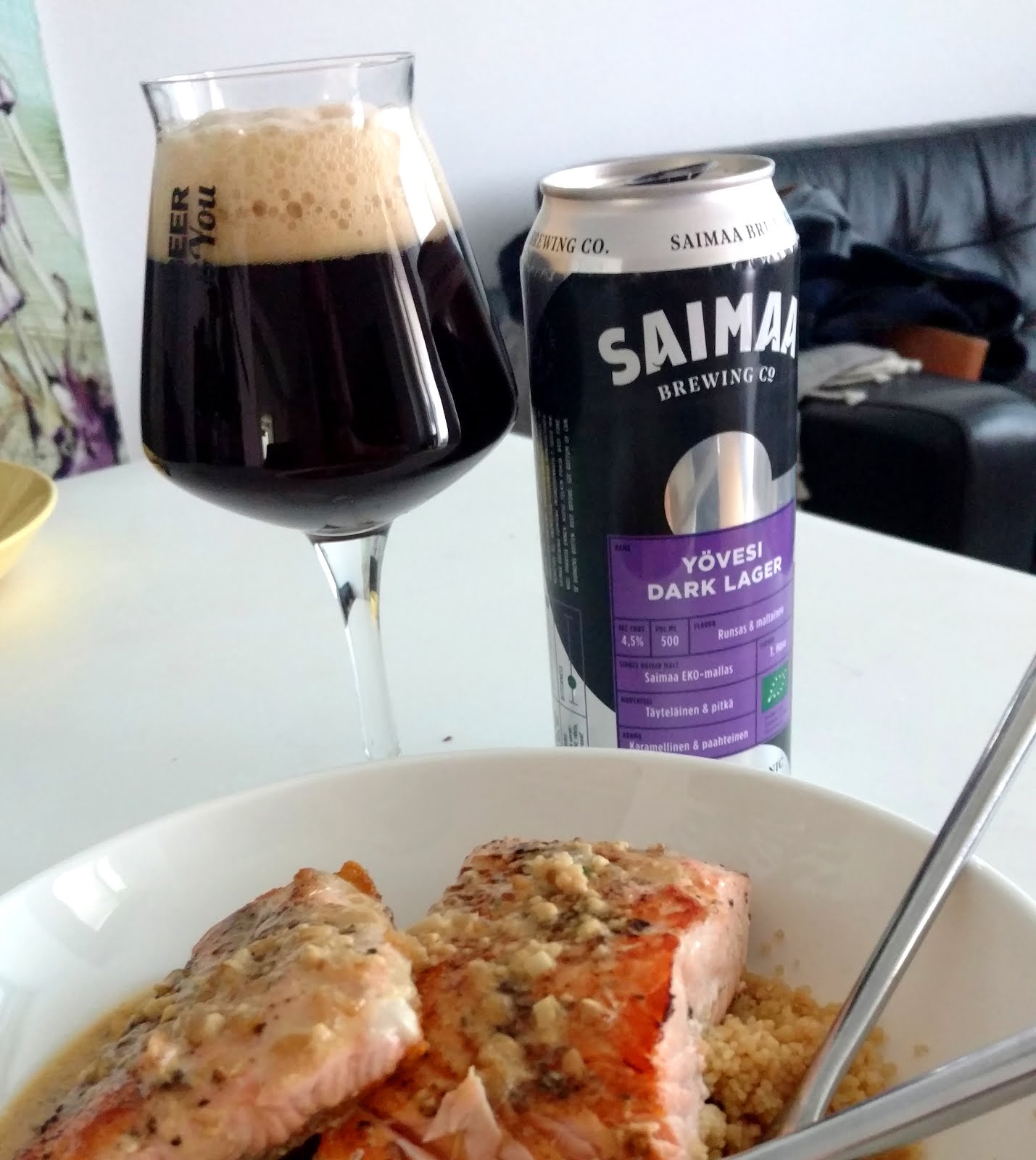Käytin oluen craft beer -keittokirjan reseptissä brown alen sijasta. ”Humalaisen kuskusin” nesteenä toimi, paistetun lohen kaveriksi tehdyssä dijon-kermakastikkeessa heikommin. Puoli tölkkiä jäi ruokajuomaksi. Ihan menettelevä ruokajuoma, jos pyöreämmän pehmeä ja vielä leipäisempi olisi saanut olla.