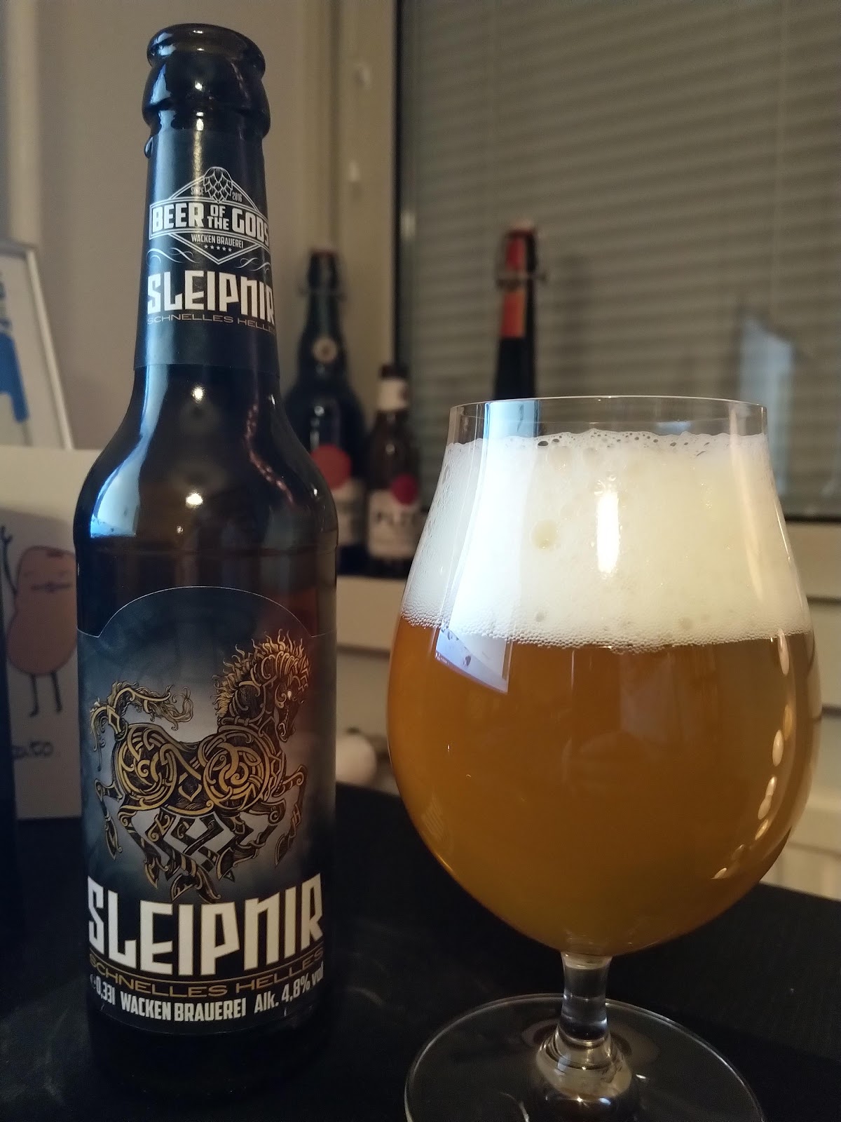 Vieläpä panimolta, josta en ollut koskaan kuullutkaan ja jossa on seitsemää erilaista olutta. Wacken Brauerei on ihan pränikkä, hädin tuskin parin vuoden ikäinen, panimo. Kuten nimestä voi päätellä se sijaitsee Wackenin kaupungissa, jonka kaikki pitkätukkaiset, nahkatakkiset saakelinpalvojat toki tietävät parhaiten maailman suurimman metallifestarin Wacken Open Airin kotina. Oluissa on viikinkijumalat teemana ja panimon iskulause on täten ”Beer of the Gods”. En usko, että näin hevikansaa puhuttelevaa teemaa on ihan vahingossa Wackenissa valittu.