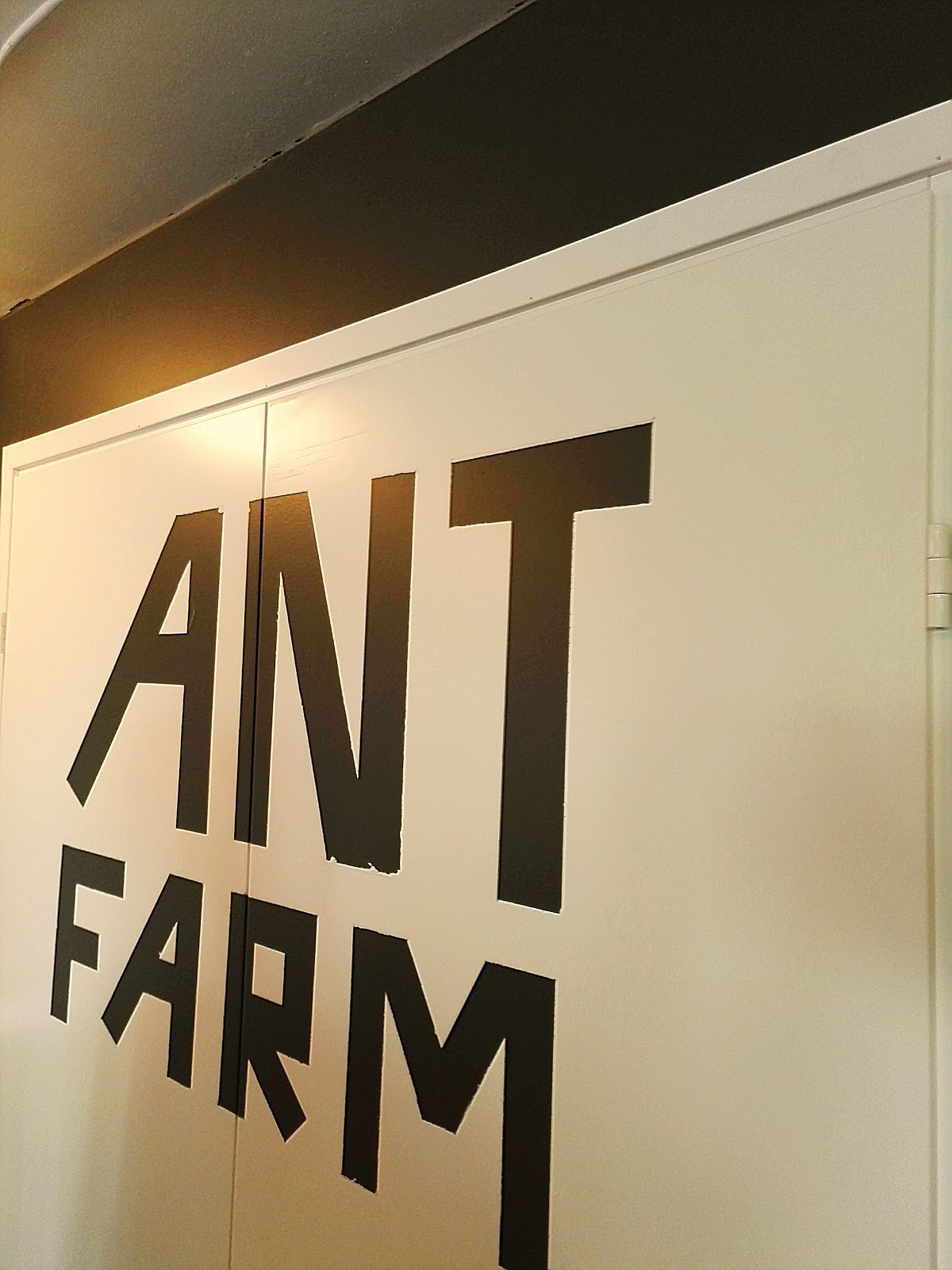 Antfarmilla on siis noin 30m2 touhutila salaisessa lokaatiossa siinä Siionin temppelin vieressä, heti vapaamuurarien suurloossista vasempaan Suomen Lahes.