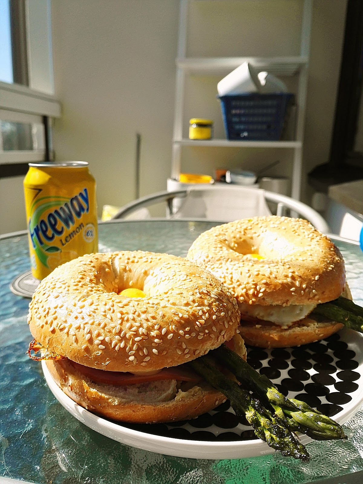 Olin duunannut ”liiterin” valikoimista keväiset bagelit parsalla ja munilla, joiden kaveriksi olikin sitten erinomaiseksi havaittua Freewayn sitruunalimua, sitä jossa sitruunamehua on oikeasti seassa ja jälkiruuaksi mutteripannusta tuoreet sumpit ja pari palaa suklaata. Voiko parempaa olla? Tätä kirjoittaessa odotan jo ensi kevättä vesi kielellä.