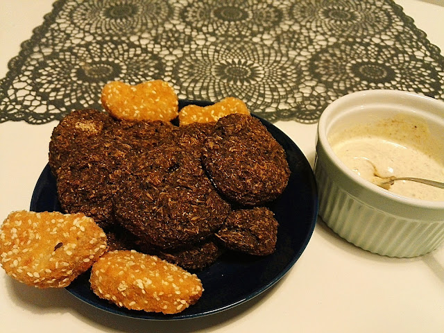Yllätin itsenikin. Idea oli aivan hullu, mutta maku on todella lähellä oikeaa. Lisäksi omatekoisissa on kerrankin sopivasti mausteita ja potkua. Rapea päältä, mehevä sisältä. Huomiona lähinnä se, ettei mallasrouhe ole kenties aivan niin kiinteää liisteriä, kuin kikherne/härkäpapu viritykset, joten massasta tulee vähän hankalampi työstää.