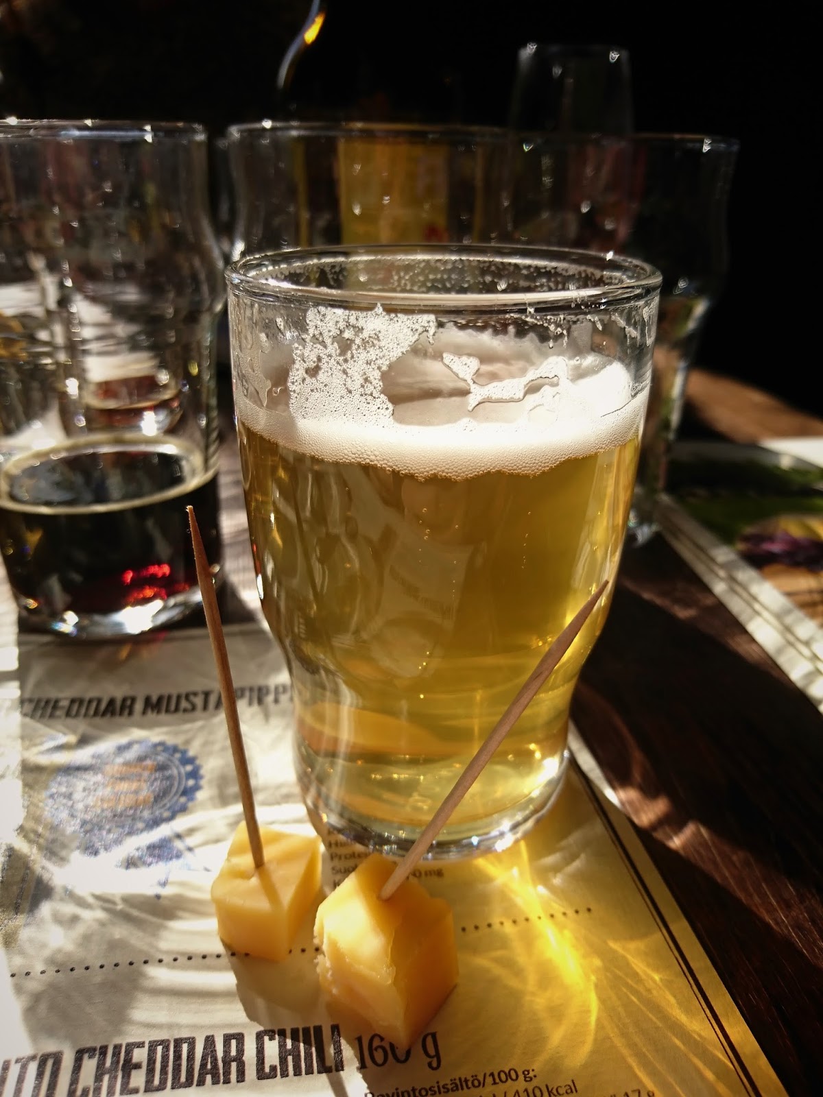 Toisena maisteltiin Ich Bin Ein Berner -gosea ja chilicheddaria. Olut pehmensi chilin makua ja toi makukomboon mielenkiintoista hapanimelyyttä. Testasin chilicheddaria myös Dieterin kanssa ja totesin, että tässä yhdistelmässä puolestaan vadelma nousi esiin ja chili jäi hieman taka-alalle. Päädyin vielä parittamaan gosen ja mustapippurijuuston, jotka olivat mielestäni pikkuisen harmonisempi ja tasapainoisempi pari kuin chilicheddar ja gose. Gosen suolaisuus nousi esiin enemmän mustapippurin maun kanssa. Mallailin chilijuustoa melkein kaikkien maistelun oluiden kanssa, mutta se tuntui olevan vähän vaikea paritettava. Miedompien oluiden kanssa chili hieman peitti oluen makua ja vahvempien oluiden kanssa taas chili tuntui peittyvän oluen maun alle.
