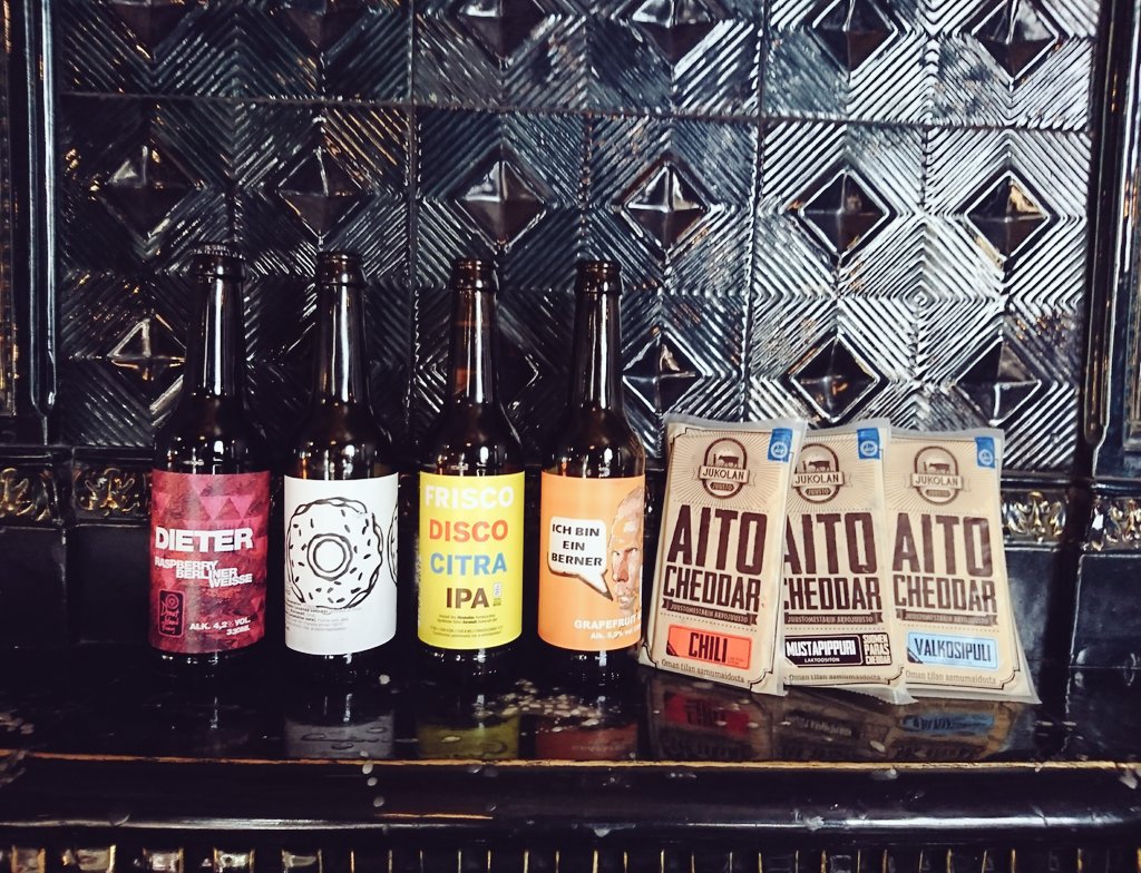 Vaikka juuston rasvaisuus ja oluen rasvaisuutta leikkaava hiilidioksidi sekä juuston suolaisuus ja oluen tasapainottava makeus ovat kuin luotu toisilleen, juustojen ja oluiden yhdistäminen on tähän mennessä ollut vielä jokseenkin underground ilmiö. Juusto- ja olutmaistelujakaan ei varsinaisesti voi sanoa Suomessa pursuavan olutravintoloiden ovista ja ikkunoista, joskin BrewDog Helsinki onkin tehnyt tällä puolella joitakin päänavauksia. Habanerokitchenin Timolta tullut kutsu bloggareille ja virallisemman mallasmedian edustajille suunnattuun Jukolan juuston ja Donut Islandin yhteismaisteluun oli siis minulle oikein kiva yllätys. Tämän viikon keskiviikkoon ajoittunut tasting pidettiin Bier-Bierin kuumimmassa kulmassa ikkunasta paahtavan auringon alla; toisin sanoen paikassa, jossa kaltaiseni pessimistikin alkoi pikkuhiljaa uskoa kesän lähestymiseen.