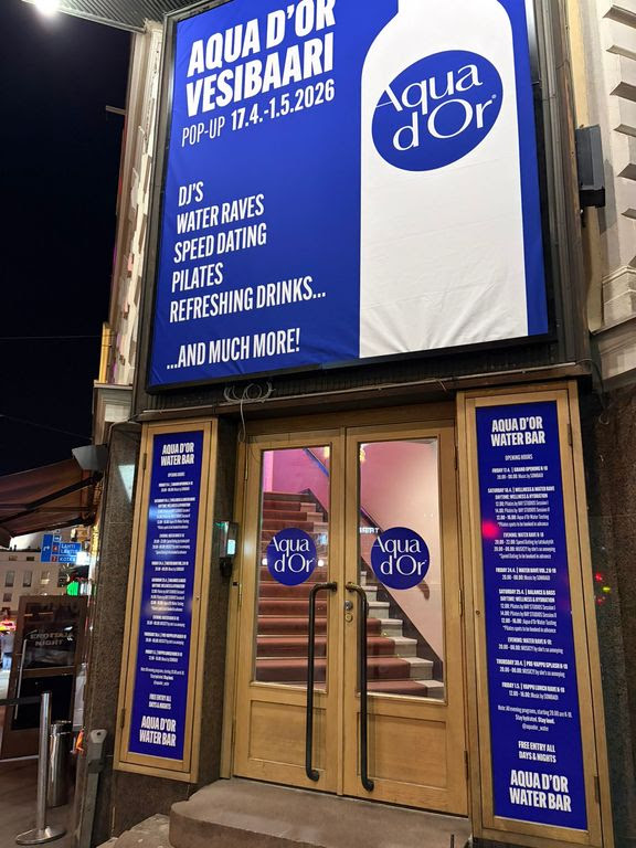 Vesibaarin taustalla on Danone, joka tuo Aqua d’Or -brändin Suomeen. Tavoitteena on herättää keskustelua hyvinvoinnista sekä tarjota vaihtoehtoinen tapa viettää aikaa sosiaalisissa tilanteissa.