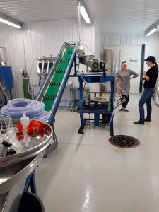 Pääsemme kiertelemään Paulan tuotantotiloissa. Ihmettelemme omenanlajittelukonetta, kylmiöitä ja — puulaatikoita (joihin muuten kaikki Achrenin omenat poimitaan). Siiderintuotantotiloissa laitteisto kiiltelee uutuuttaan. Koska olemme Jennin kanssa Stadin Panimolla töissä, käymistankit, etikettikone ja hiilihapotuslaite ovat tuttuja ja omenanpuristin kiinnostaakin meitä eniten. Vanha 80-luvun suomalainen laite toimii Paulan mukaan hienosti: hän vannoo laitteen nimeen, ja toivoo ettei sitä jouduta vaihtamaan. Laitteen etu on se, että sillä voidaan puristaa myös hyvin pieniä määriä omenoita. Syksyisin Paulan tilalla käykin paljon asiakkaita puristamassa omista omenoistaan mehua.